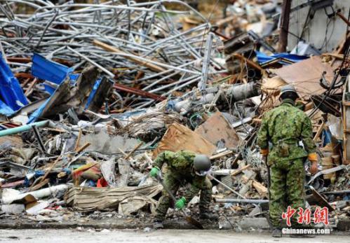 資料圖:2011年4月,救援人員在日本宮城縣女川町的地震海嘯災(zāi)區(qū)清理廢墟。中新社發(fā) 侯宇 攝