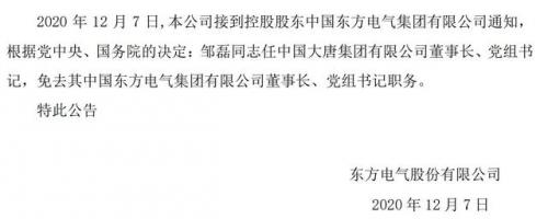 今日(12月7日),中國大唐集團(tuán)官網(wǎng)宣布,當(dāng)日上午,公司召開中層以上管理人員大會。中央組織部有關(guān)負(fù)責(zé)同志宣布了中央關(guān)于中國大唐集團(tuán)董事長、黨組書記調(diào)整的決定:鄒磊任中國大唐集團(tuán)董事長、黨組書記,免去其東方電氣集團(tuán)董事長、黨組書記職務(wù)。