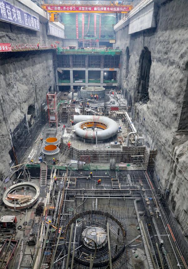 隨著各關鍵環(huán)節(jié)逐一打通,梅蓄項目建設也按下了“快進鍵”。在電站主廠房,記者看到,一個大型的環(huán)形“蝸殼”正在焊接組裝;再往前走,一個巨大的“深坑”映入眼簾,這里便是整個梅蓄電站的“心臟”。放眼望去,只見4臺機組點位旁都圍滿了工人,正熱火朝天進行施工作業(yè),最遠端的機組,已在進行外部建筑物的澆筑,雛形初現(xiàn)。走出廠房外,兩座雄偉的大壩矗立在青蔥山林間,與兩個巨大的庫區(qū)遙相呼應,顯得壯觀無比。